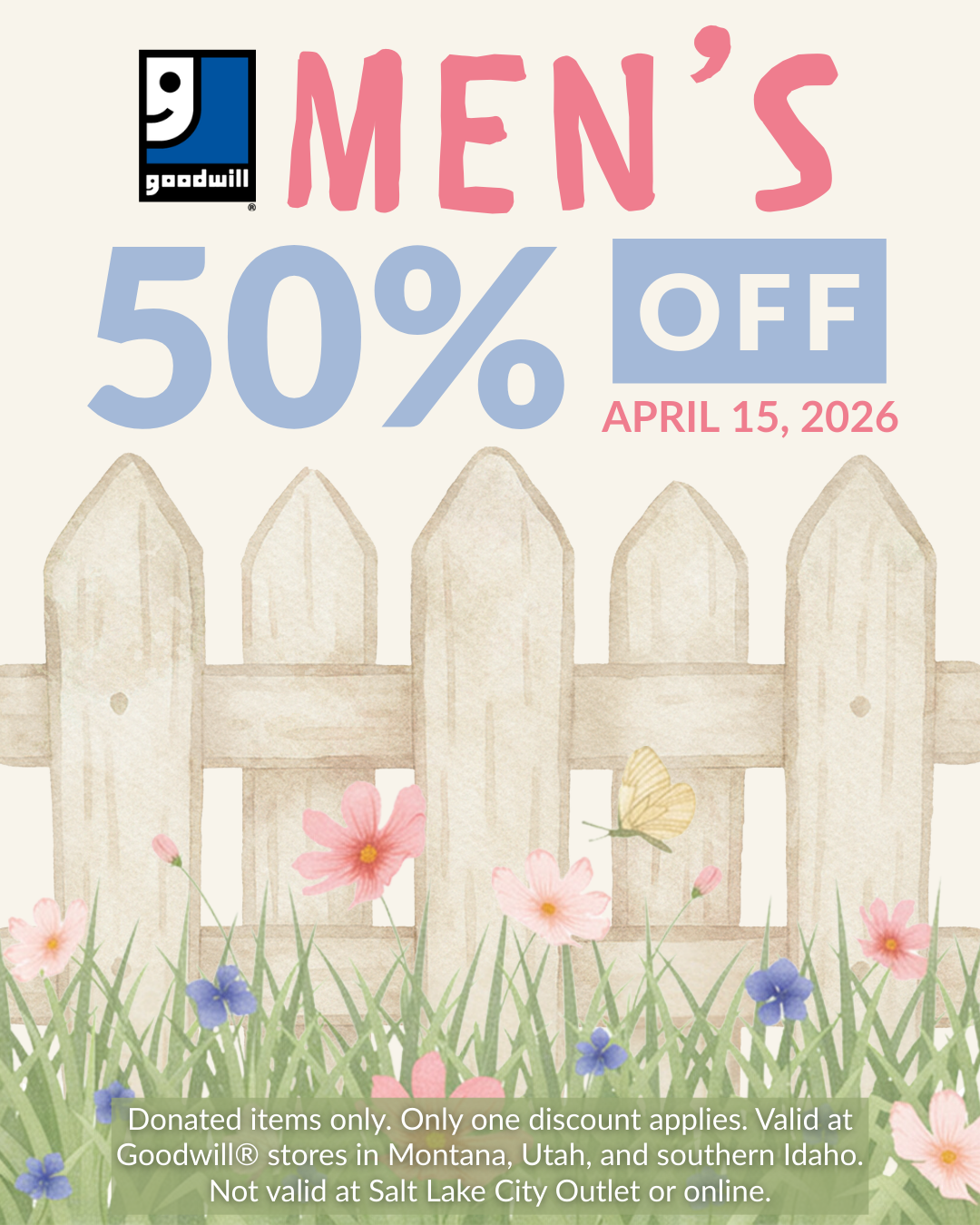 Save 50% on all donated men's clothing (shoes excluded). Show this coupon to the cashier to receive the discount. Only one discount applies. Excludes new items and is not available […]